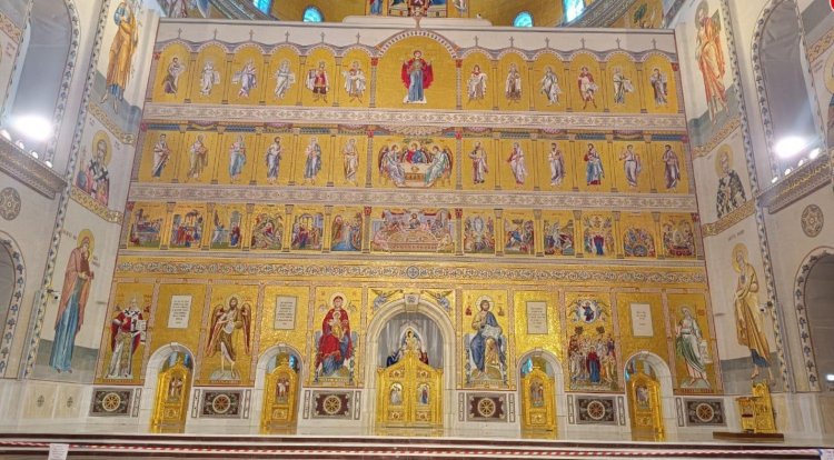 Iconostasul - având o suprafață de 406,98 metri pătrați, cu o lungime de 23,8 metri și o înălțime de 17,1 metri, cuprinde 45 de icoane, dispuse în patru registre, în timp ce Icoana Maicii Domnului Platytera, din absida altarului, cu o înălțime de 16 metri, este cea mai mare reprezentare a Maicii Domnului în mozaic din România și una dintre cele mai mari din lumea ortodoxă.