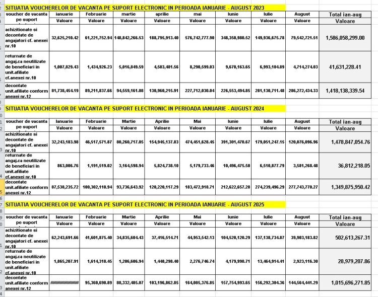 Comparativ cu august 2024, în august 2025 s-au emis cu 66,7% mai puține vouchere, iar numărul celor decontate a fost cu 48% mai mic.